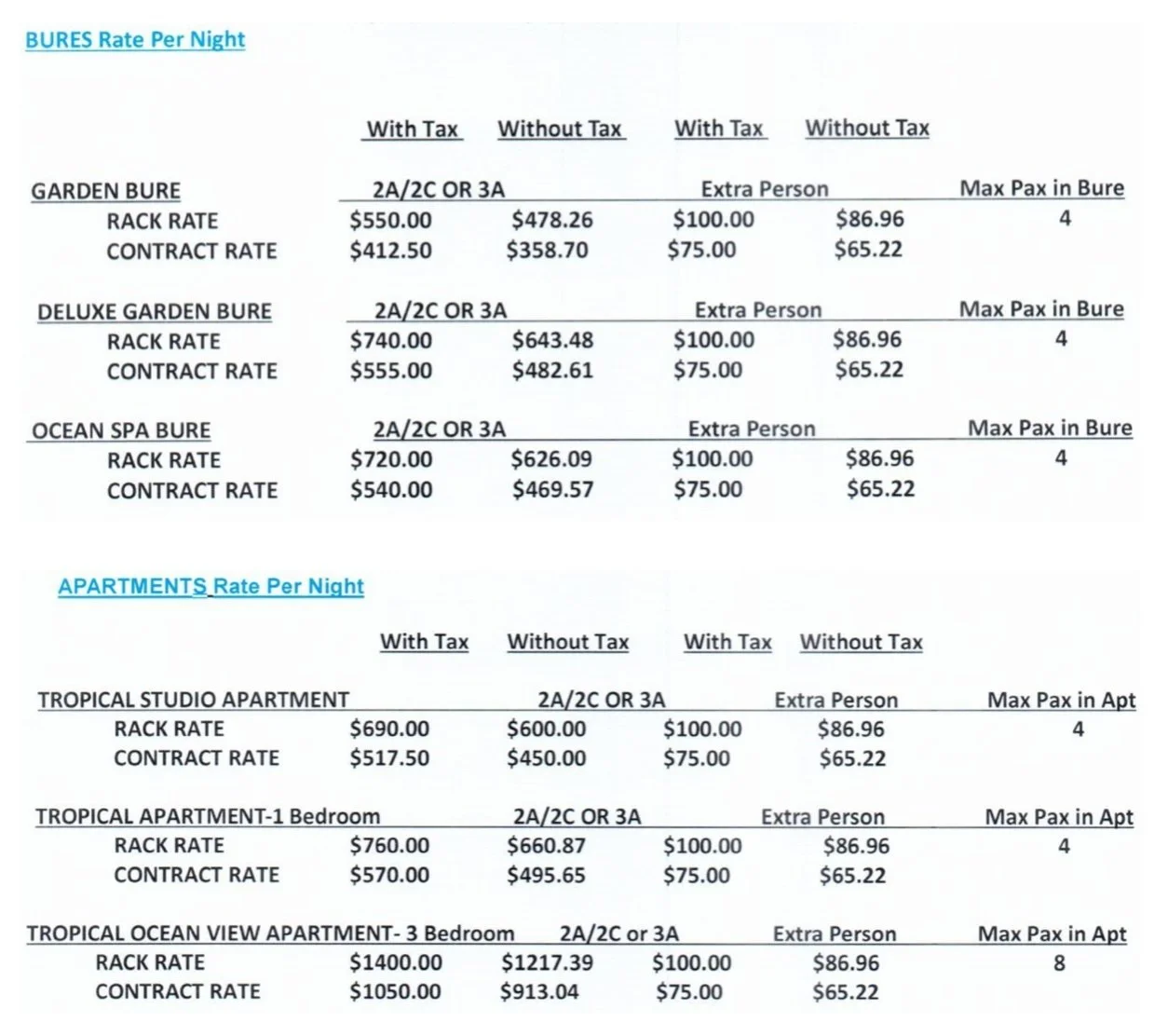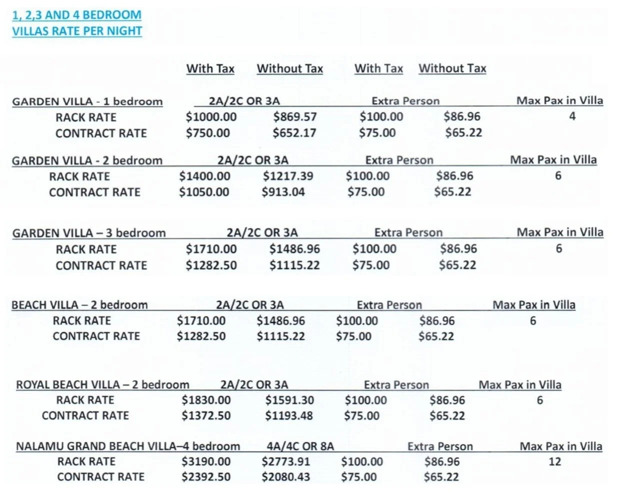 Fiji’s tax (VAT/GST) is 15% and included in the With Tax total above. Rack rate is retail, contract rate with tax is what OSE clients pay per night. Rates are shown in Fiji dollars (FJD) and apply from 1 April 2025 to 31 March 2026.