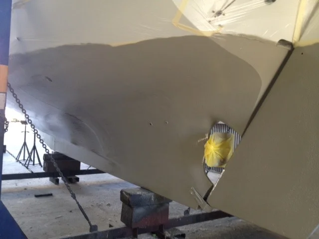 One of the many stages of layering the new epoxy, primer and anti-foul onto the fresh hull