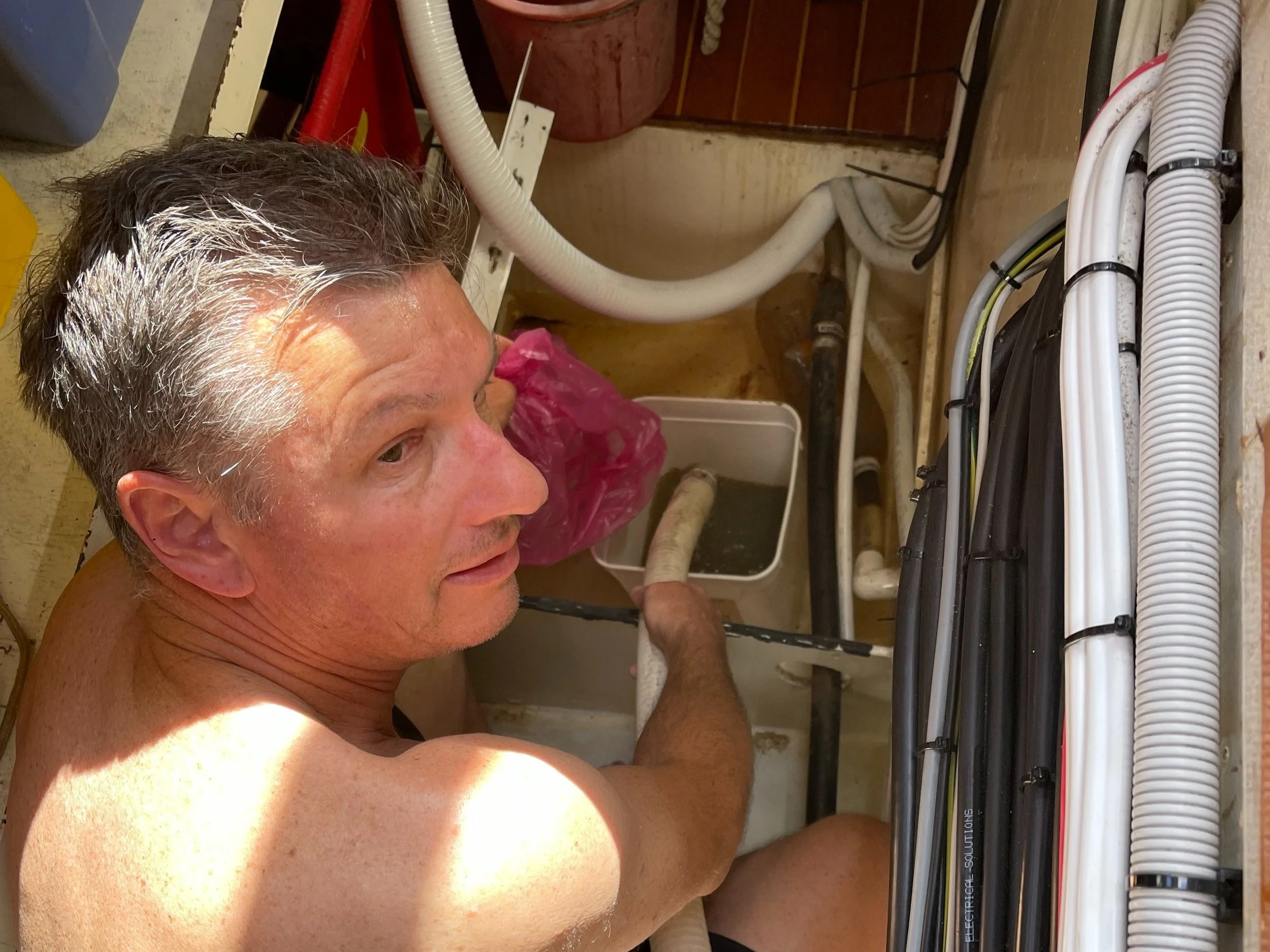 Running aground at Fraser Island and replacing 8m of black water hose after the toilet blocks up, on a passage north to Hamilton Island in 2021