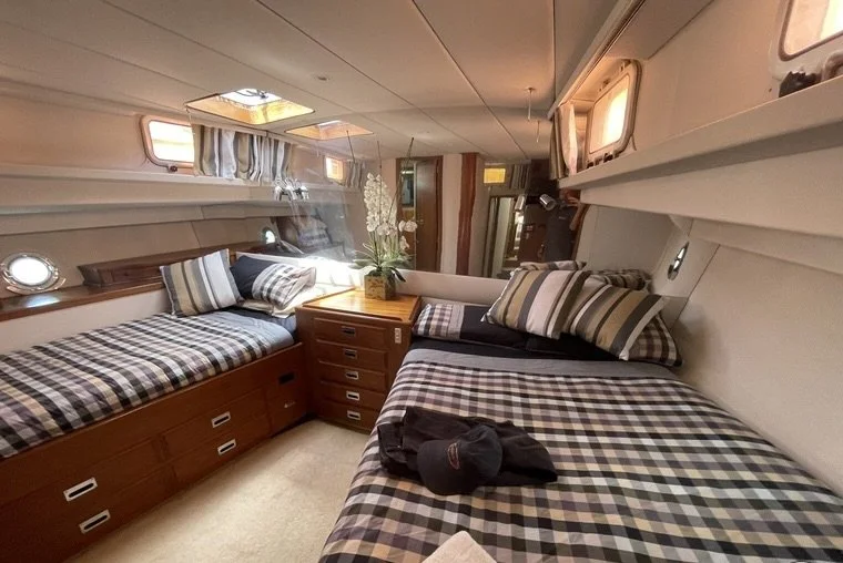 The 12 berth / 4 cabin layout is fairly spacious due to the beamy design of the hull. With ample built in furniture, stowing your gear while onboard is easy and the well lit cabins, provide an alternative space to relax at sea or at anchor.